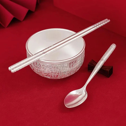 BRIDAl & BIRTHDAY GIFTS | Handcraft 99.9% Pure Silver Spoon 40g and Chopsticks 50g Set; Food Grade Silver Tableware for Elegant Dining