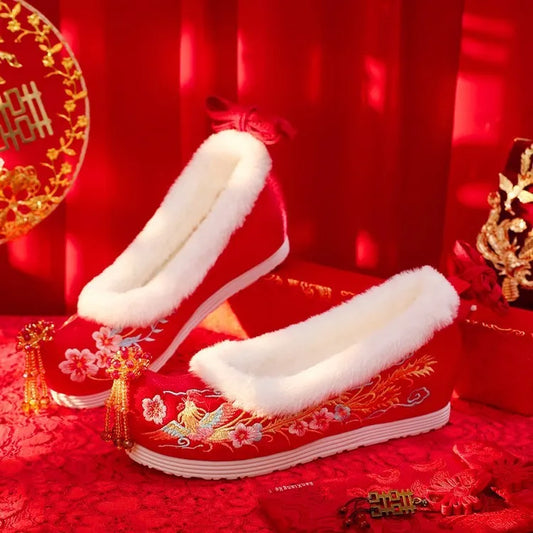2026 Winter Chinese Bridal Shoes with Pearl Tassels, Fleece Lined, 4cm Inner Height in 2 Styles (Phoenix Embroidery / Jacquard)