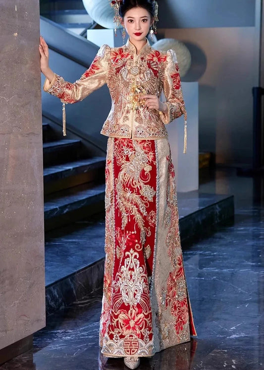 BRIDAL DRESS | 2026AW Traditional Embroidered Rhinestones Golden Dragon And Phoenix on Satin Bridal Cheongsam