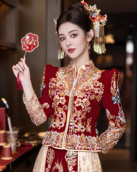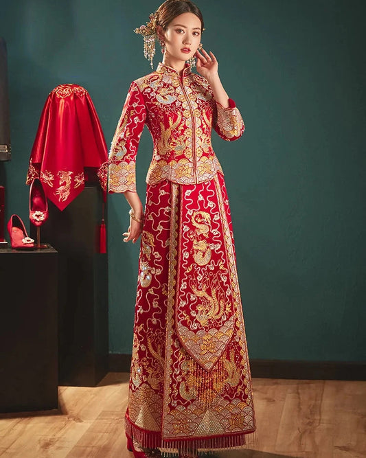 Bosi Jinse Dragon and Phoenix Embroidered Traditional Chinese Wedding Gown