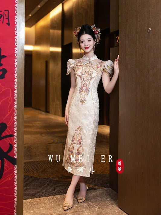 Wedding Engagement Satin Semi-Sheer Applique Tassels Summer Cheongsam