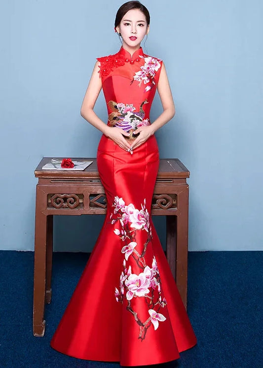 Asian Style Embroidered Trumpet Dresses for Wedding and Lunar New Year in 7 Colours; 4XL Plus Size