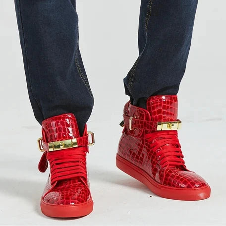 CELEBRITY STYLE |Designer Pressed Genuine Leather Men’s Metal Lock High Top Sneakers in Red & Black