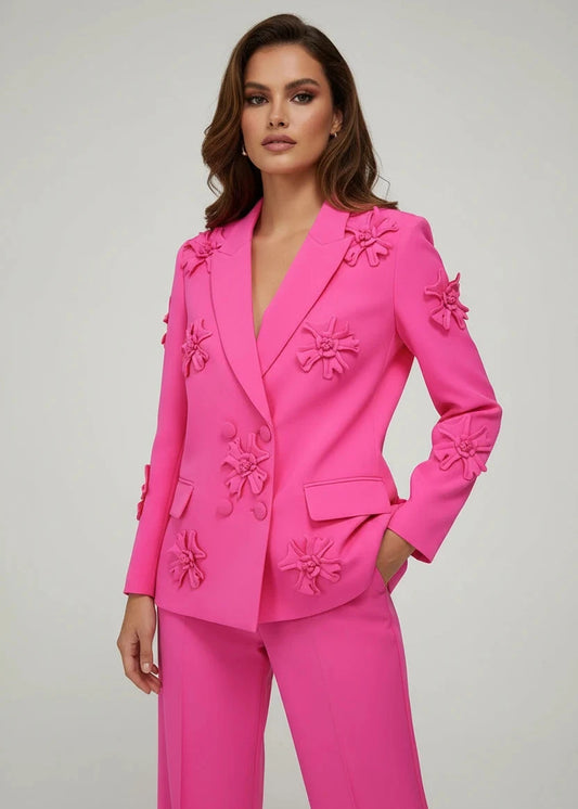EXECUTIVE OUTFITS|HIGH STREET Women's Stereoscopic Flowers Appliques Double Breasted Long Blazer in 2 Colours ; 4XL Plus Size
