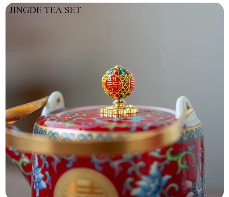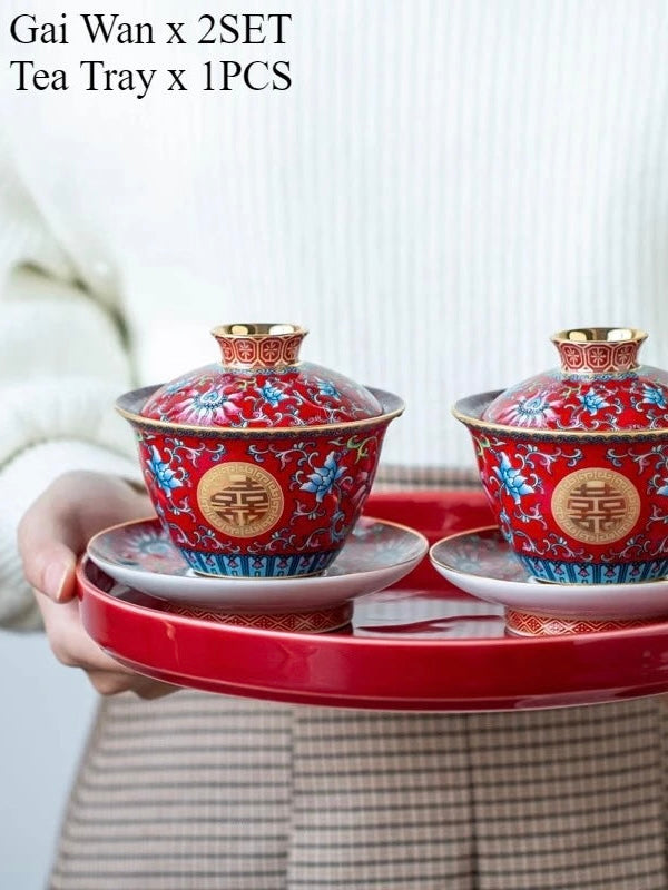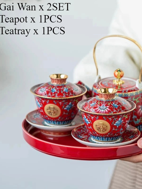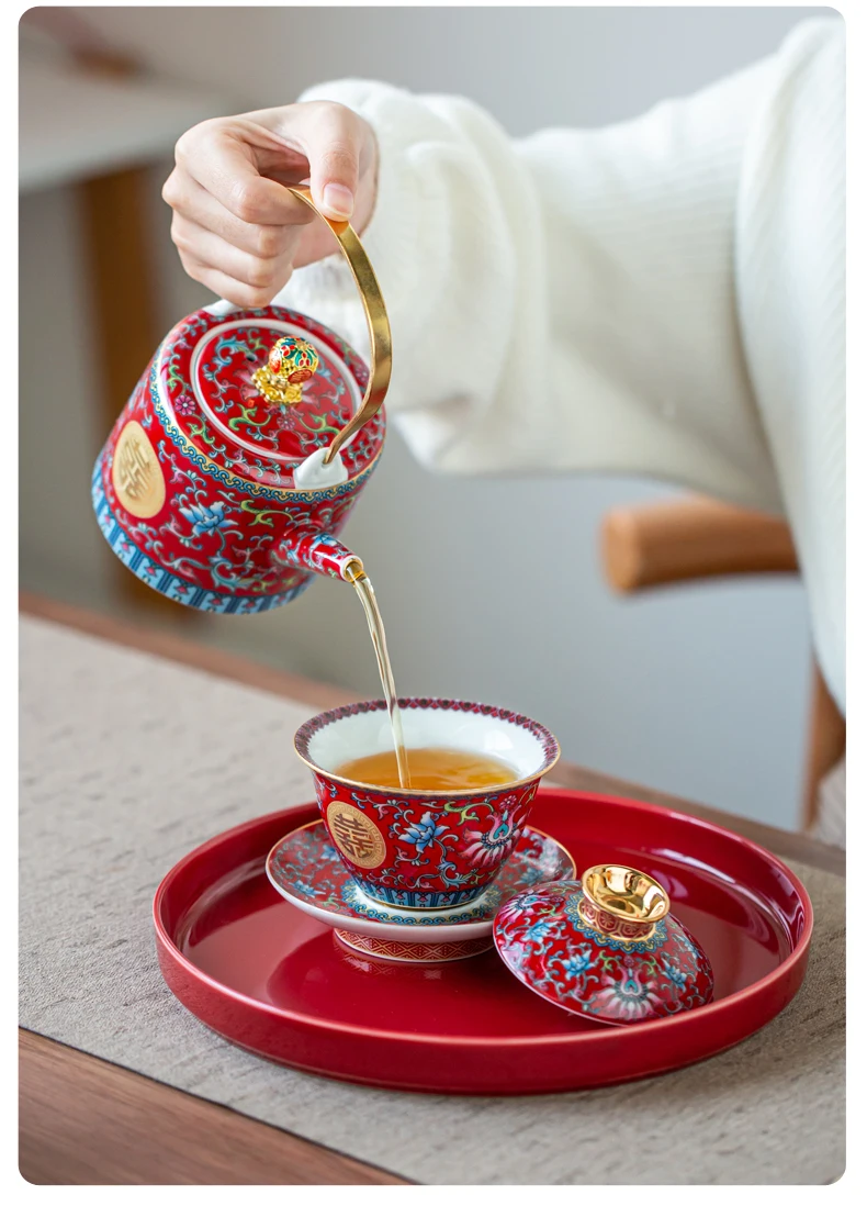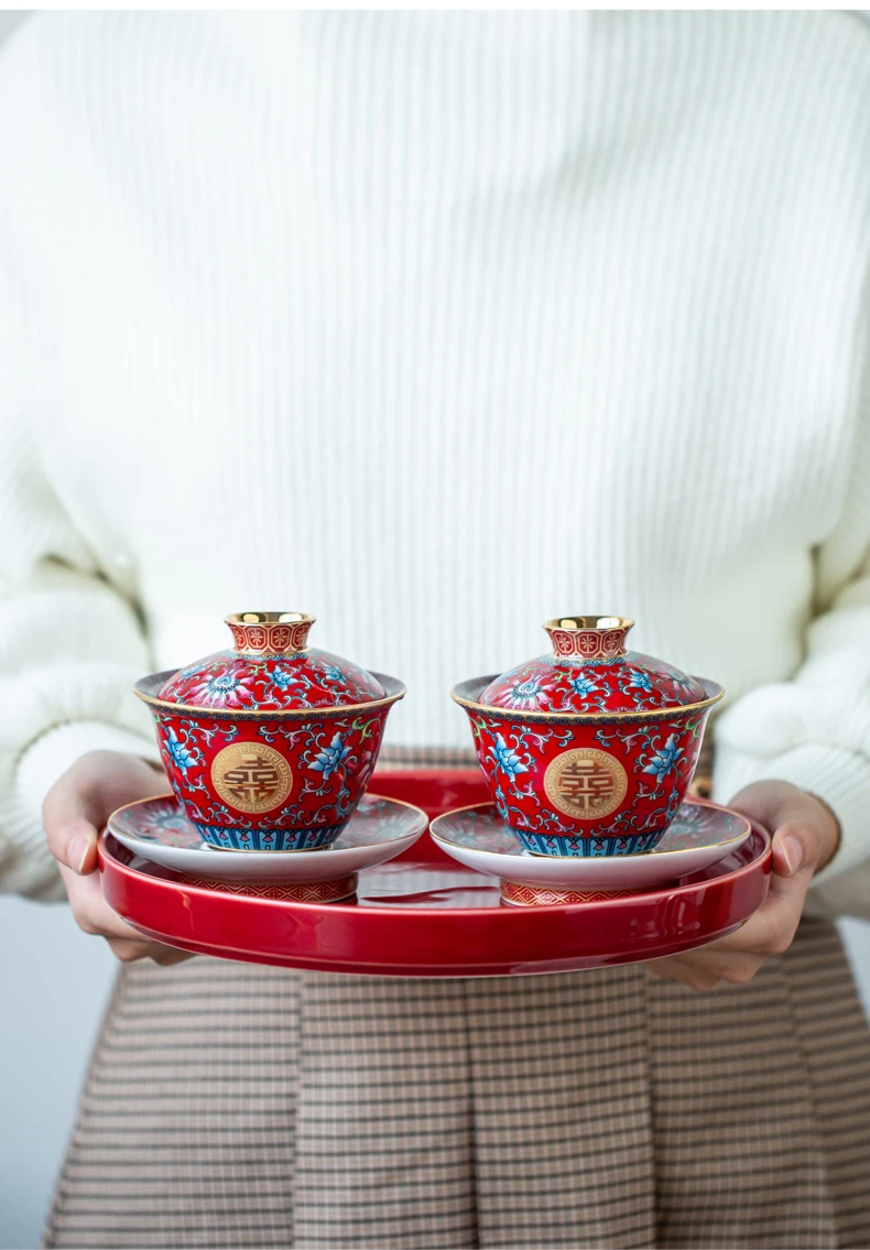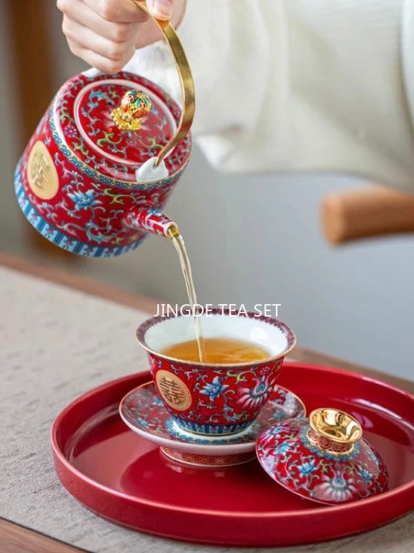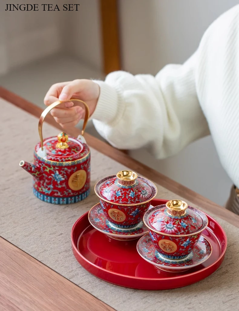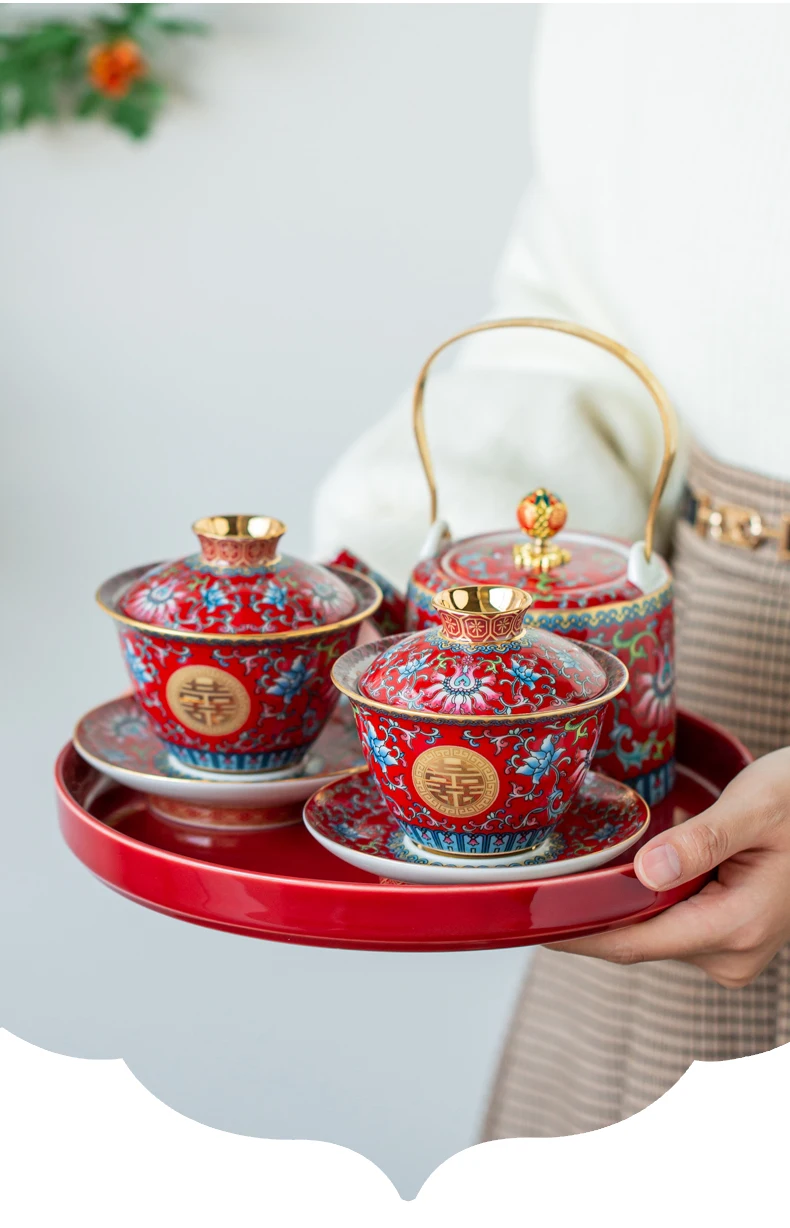طقم شاي صيني مطلي بالمينا، مطلي بالذهب، بنمط كلاسيكي، يحمل رمز السعادة المزدوجة، مناسب لحفلات الزفاف؛ يتضمن: وعاءين للشاي مع غطاء، إبريق شاي، وصينية.