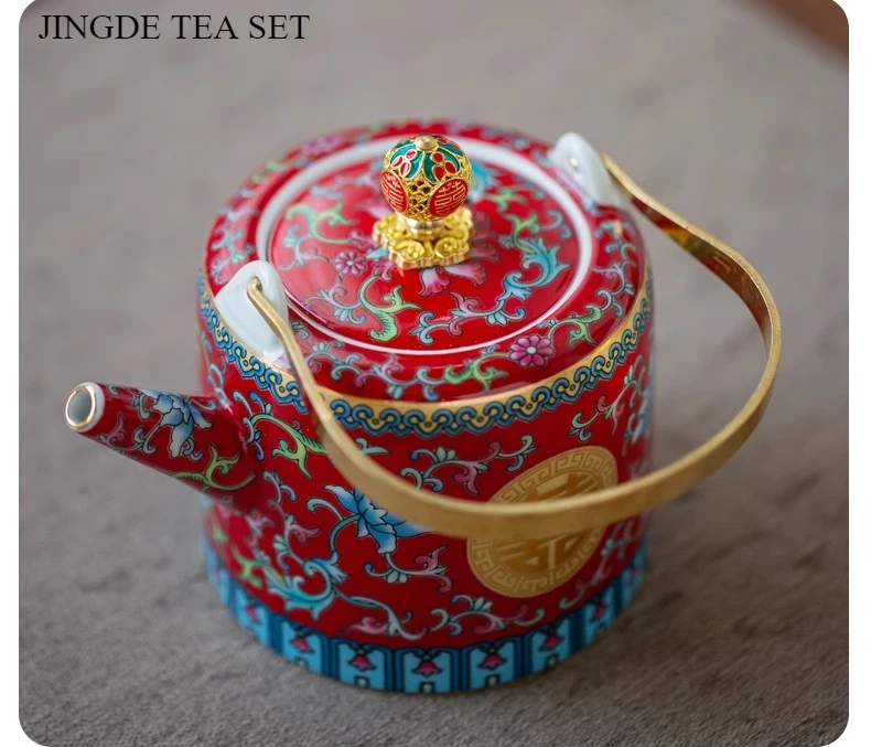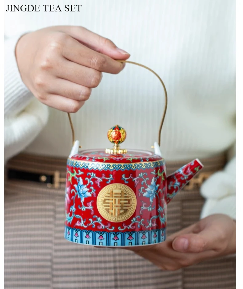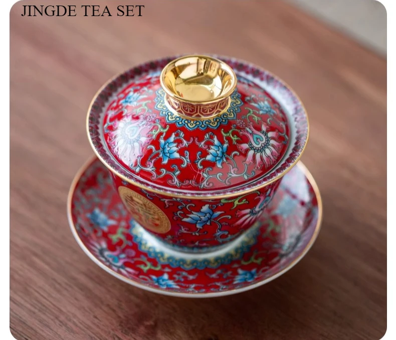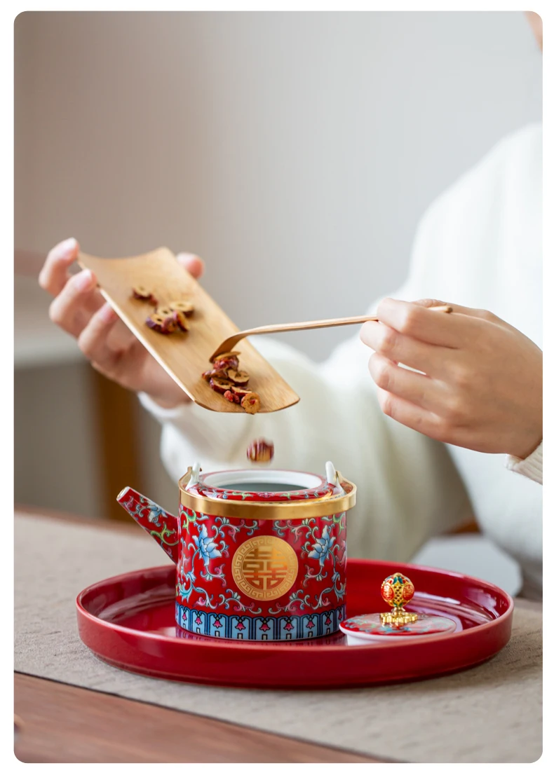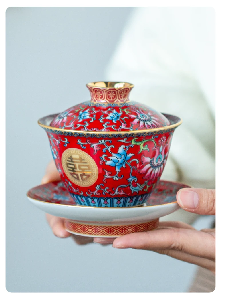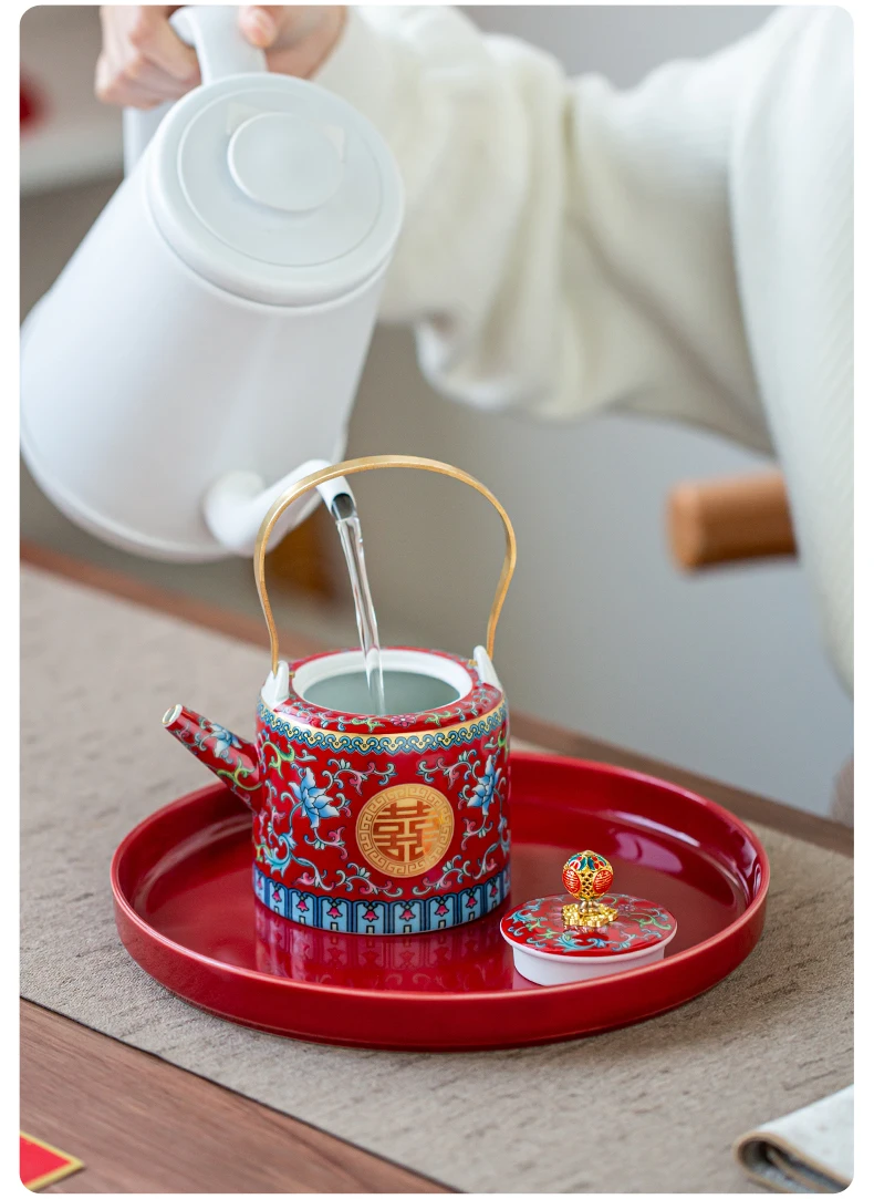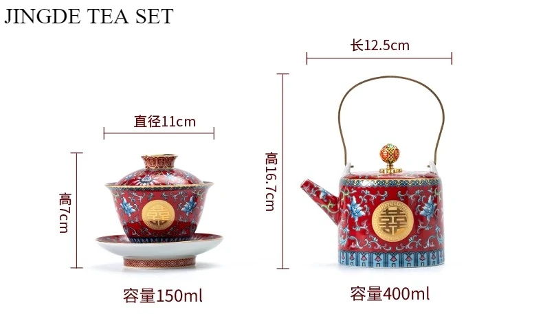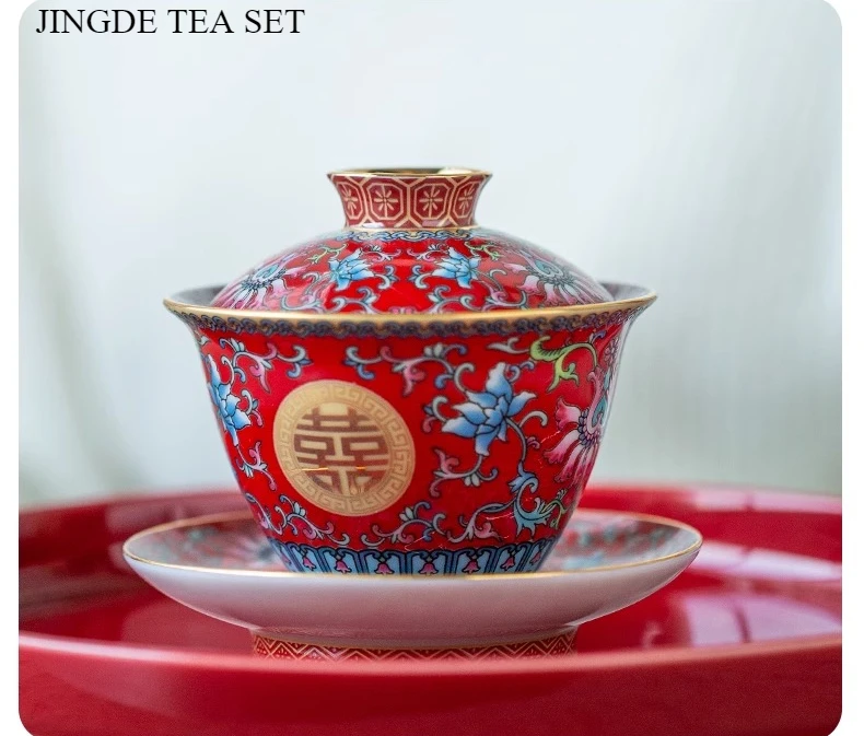 طقم شاي صيني مطلي بالمينا، مطلي بالذهب، بنمط كلاسيكي، يحمل رمز السعادة المزدوجة، مناسب لحفلات الزفاف؛ يتضمن: وعاءين للشاي مع غطاء، إبريق شاي، وصينية.