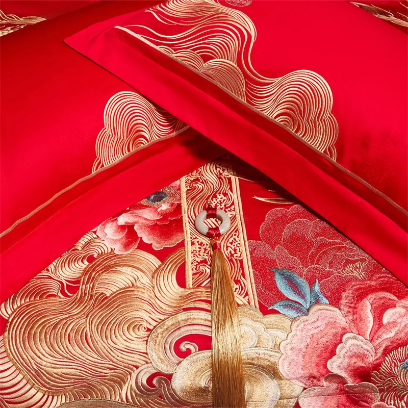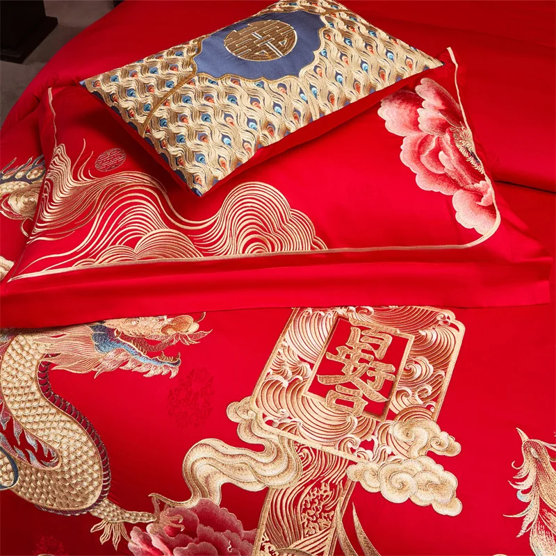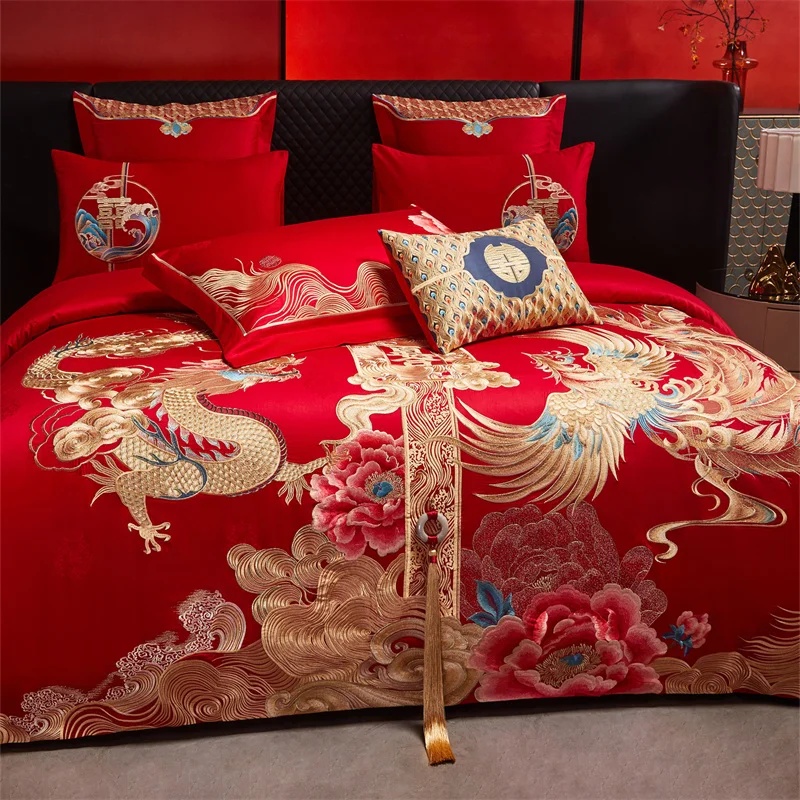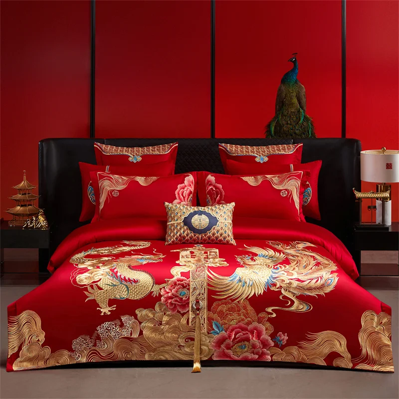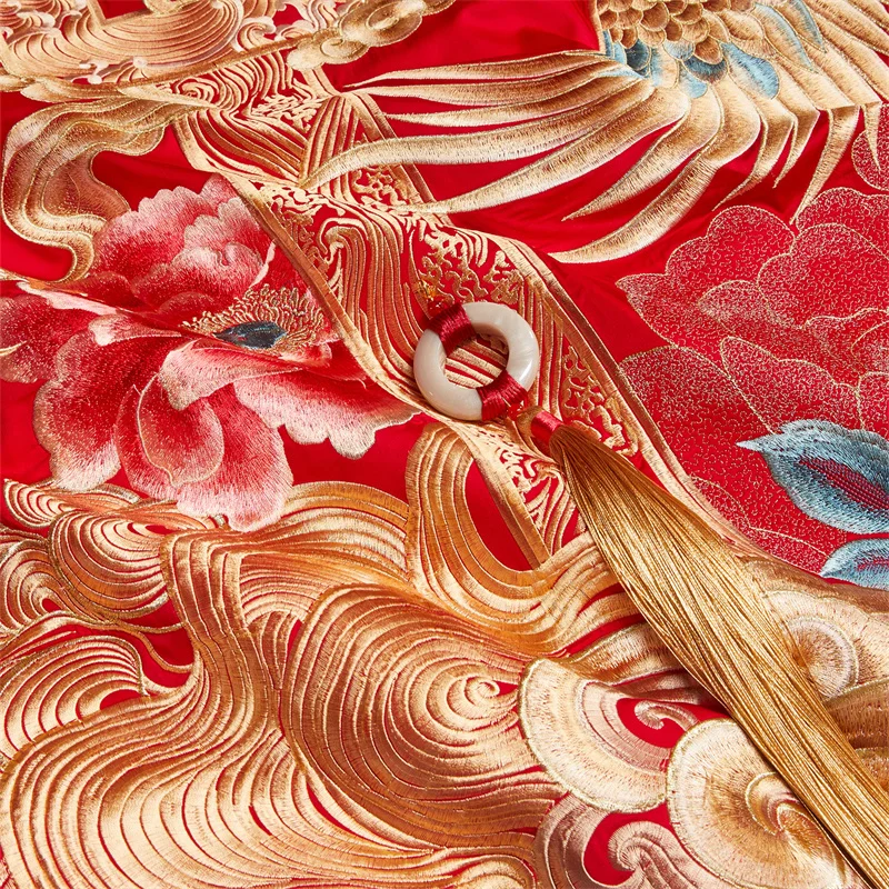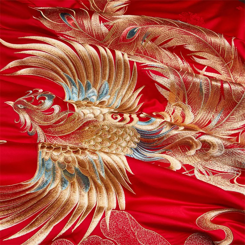 600 خيط قطن مصري؛ أطقم مفروشات زفاف صينية مطرزة بزخارف زهرية ذهبية وتنين وطائر الفينيق؛ قطن 100%، غطاء لحاف، ملاءة سرير، أغطية وسائد؛ أطقم من 4/6/9 قطع