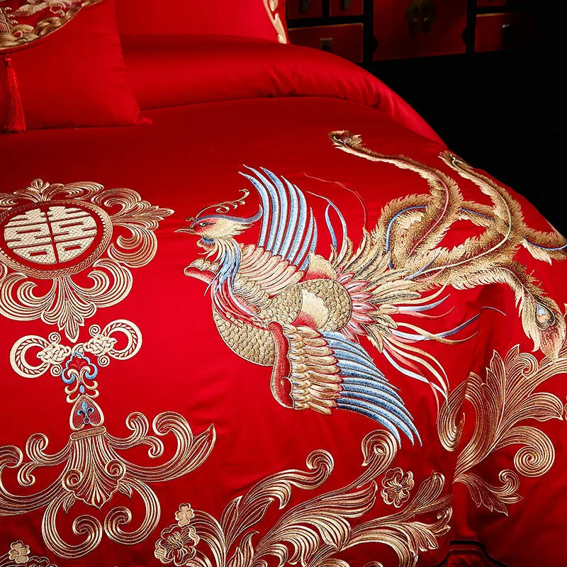 أطقم مفروشات زفاف صينية فاخرة من القطن المصري، مطرزة بشعار "السعادة المزدوجة" من جولدن لونج فينيكس؛ غطاء لحاف، ملاءة سرير، غطاء وسادة، متوفرة بمقاس كينج وكوين