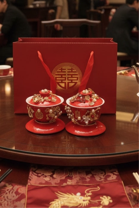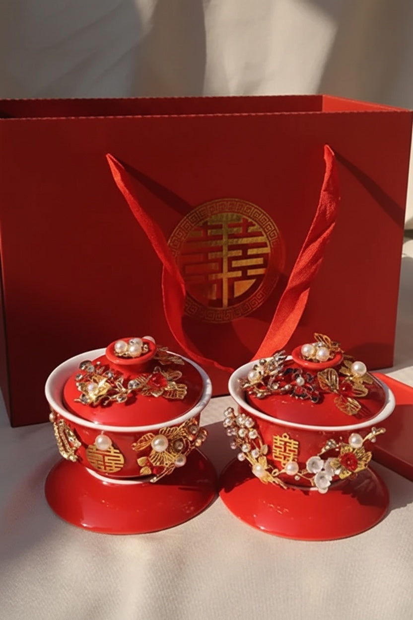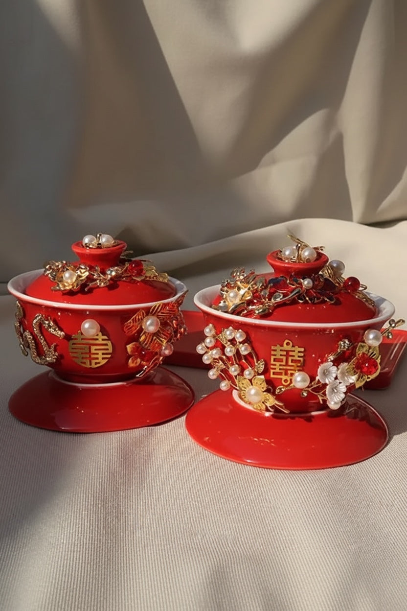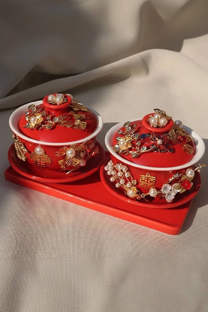 طقم مكون من وعاء شاي سيراميك ثلاثي الأبعاد مصنوع يدويًا من الذهب واللؤلؤ، يحمل شعار "السعادة المزدوجة"، مع غطاء وصحن وصينية.