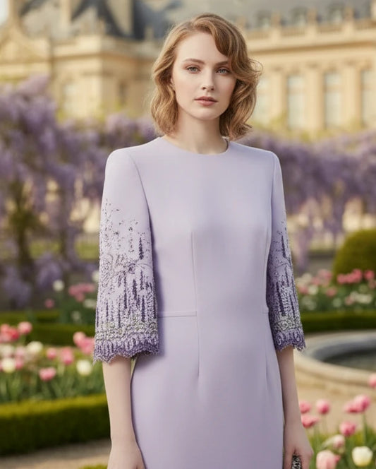 Detailed Beaded Round Neckline Short Sleeves Midi Dress in Lilac; Customization