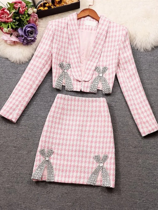 V-Neck Pearl Rhinestone Cropped Blazer and Mini Skirt Two Piece Set in 2 Colours