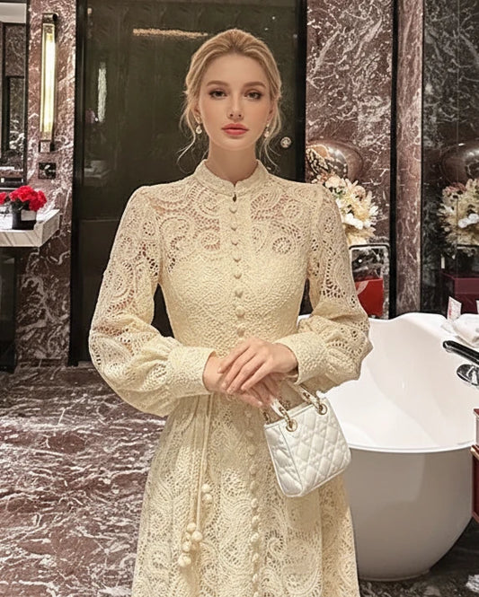 French Style Buttoned Crochet Hollow Lace Long Sleeves Maxi Dress