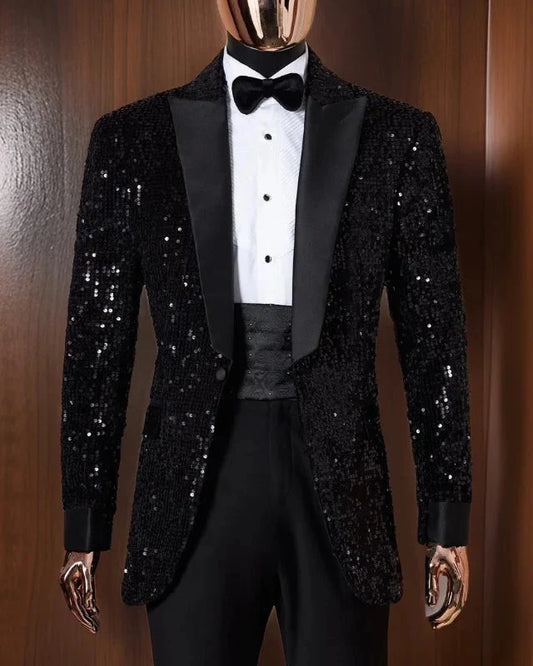 PROM OUTFITS |Sparkling Sequins 4-pc Slim Fit Tuxedo Peak Lapel, Luxury Blazer, Pants, Belt and Bow Tie; 5XL Plus Size