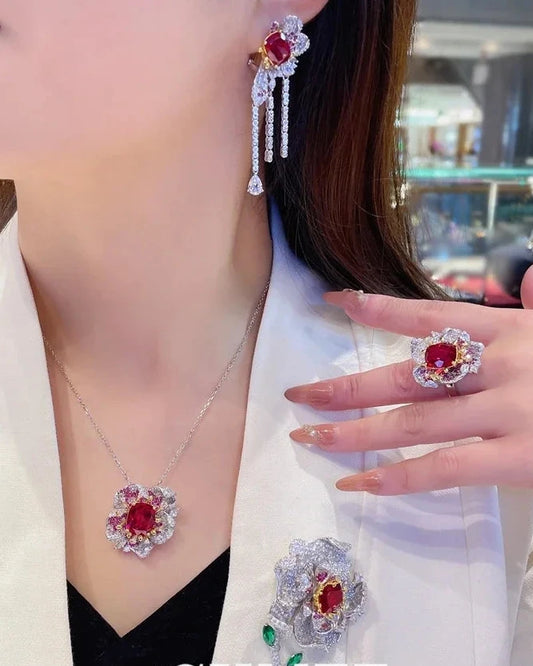 Fine Jewelry Peony Series Lab Grown Ruby Ring Earring Brooch Necklace Set for Women; 925 Silver-plated Gold