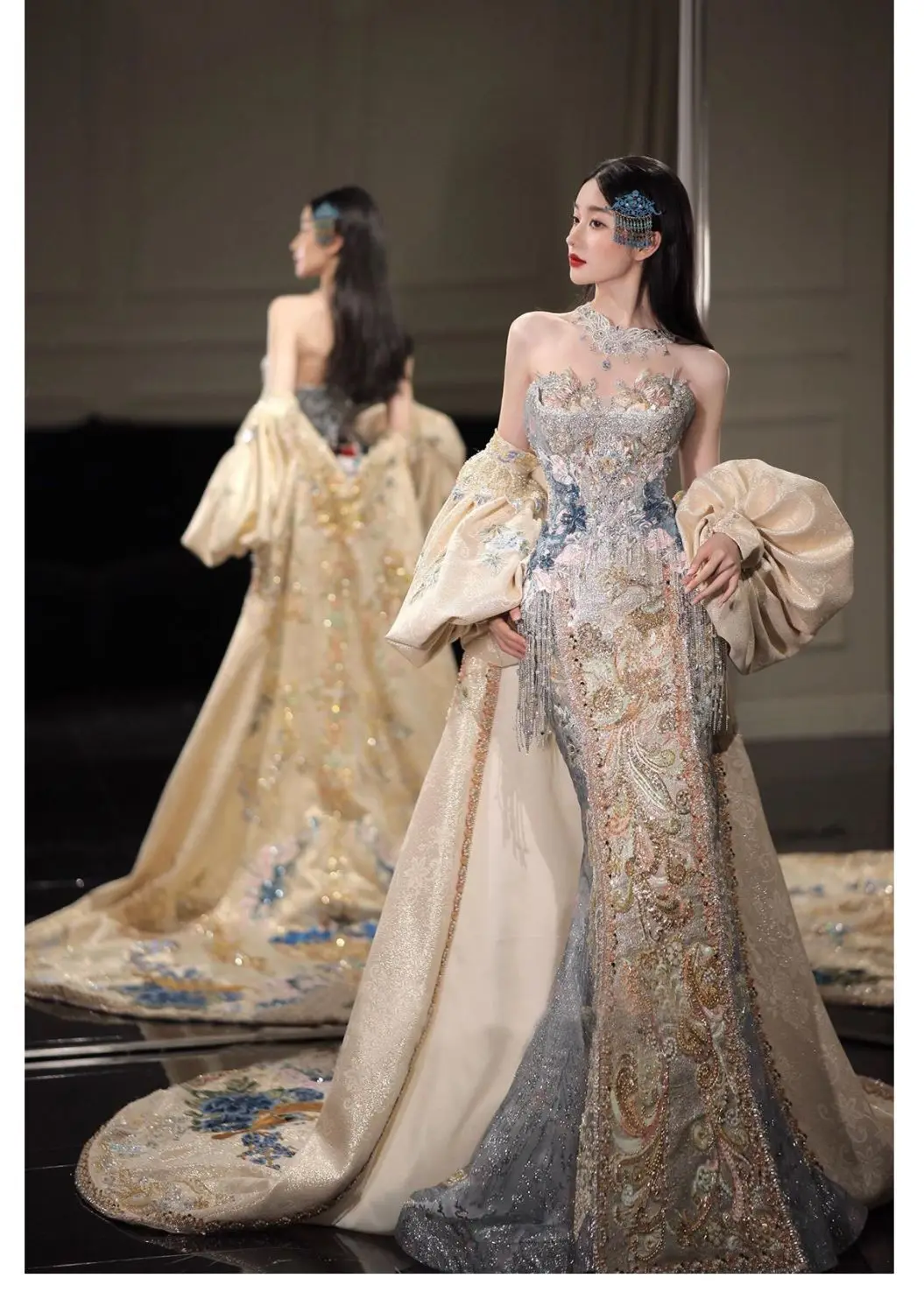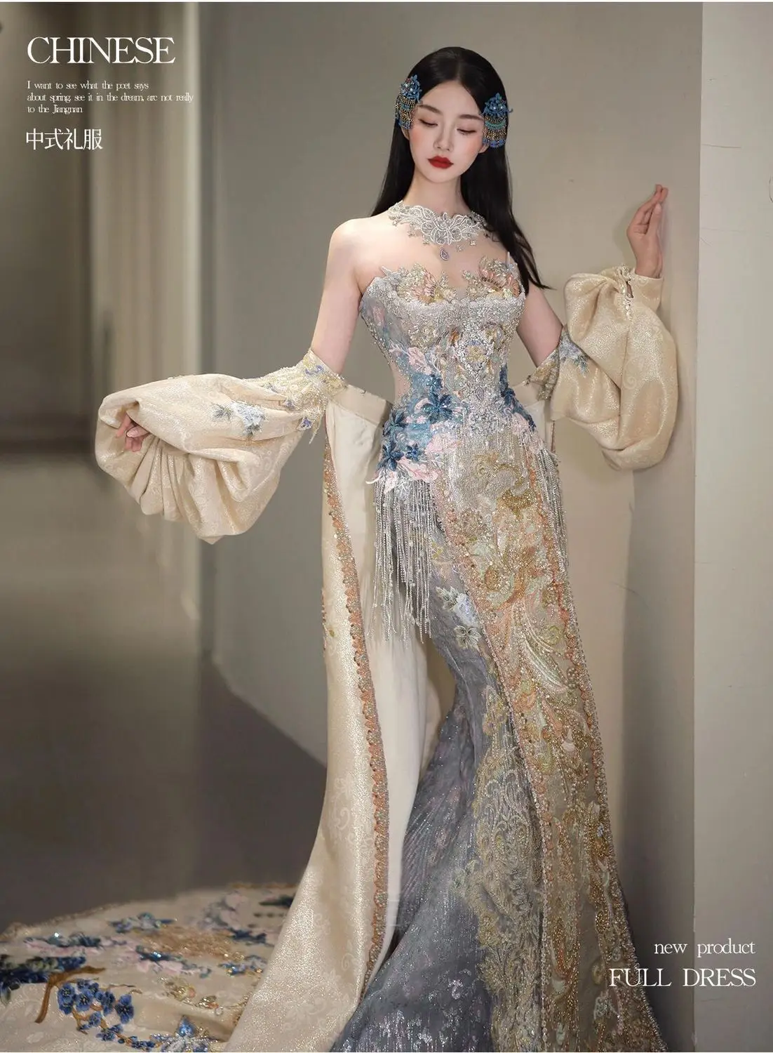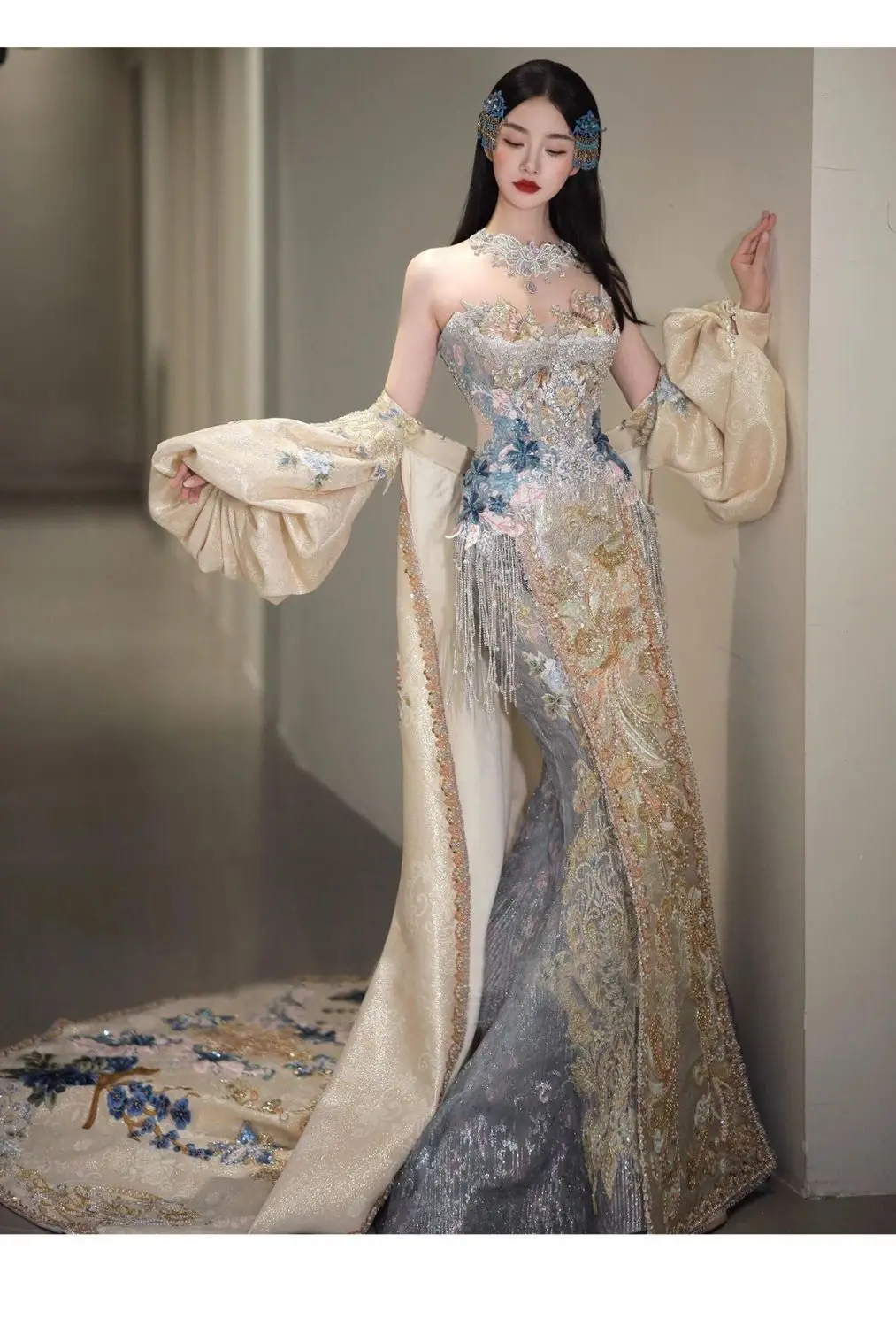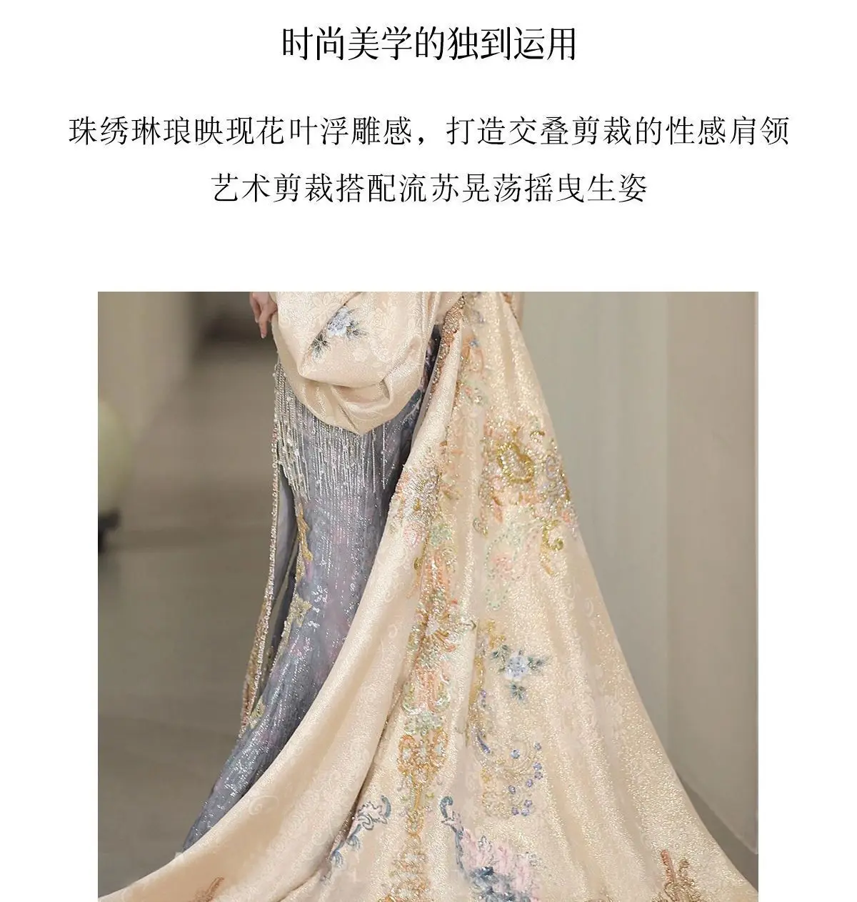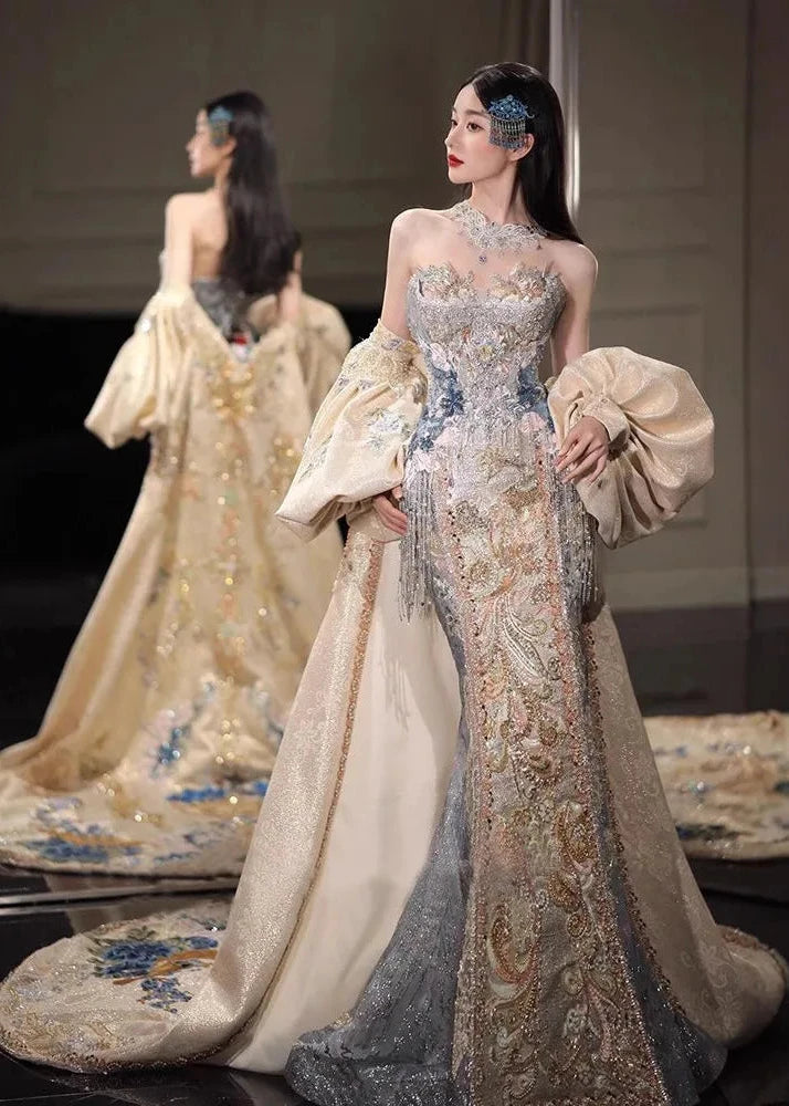Robe de bal | Collection printemps-été 2026 | Robe de soirée longue en mousseline brodée, style princesse asiatique, avec peignoir amovible