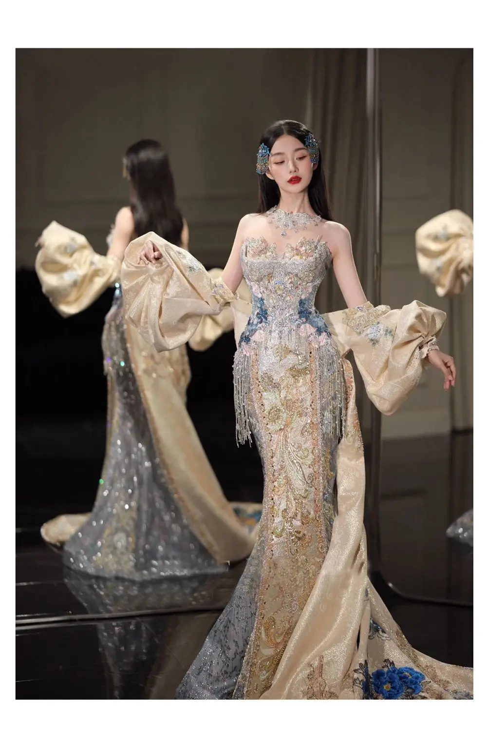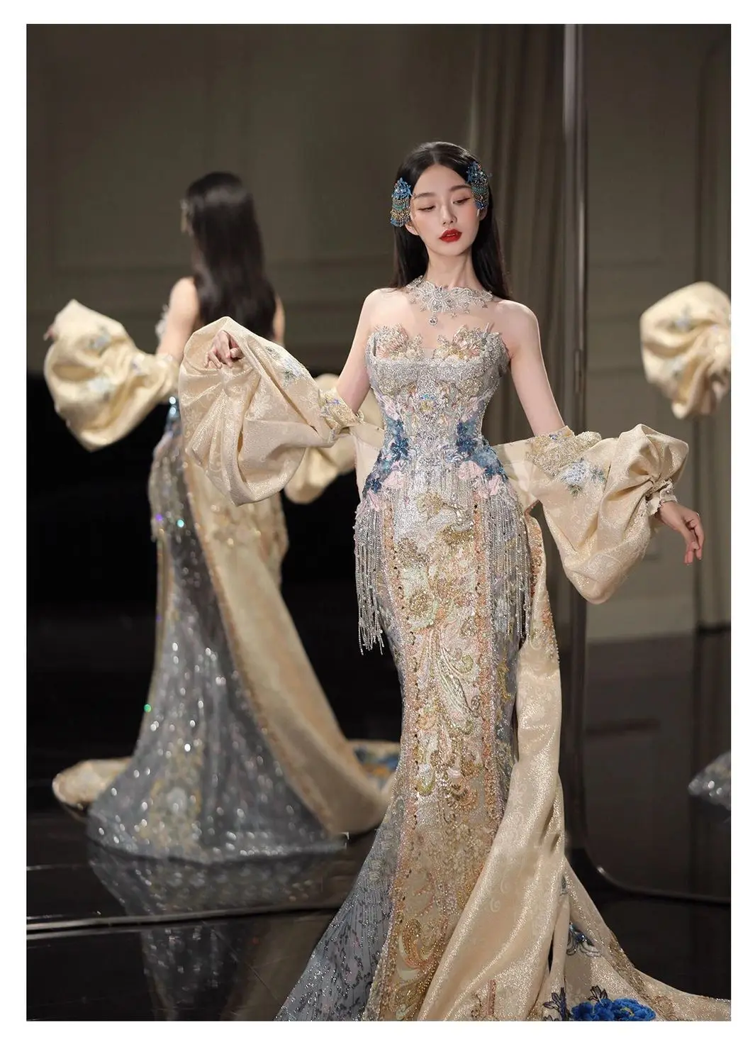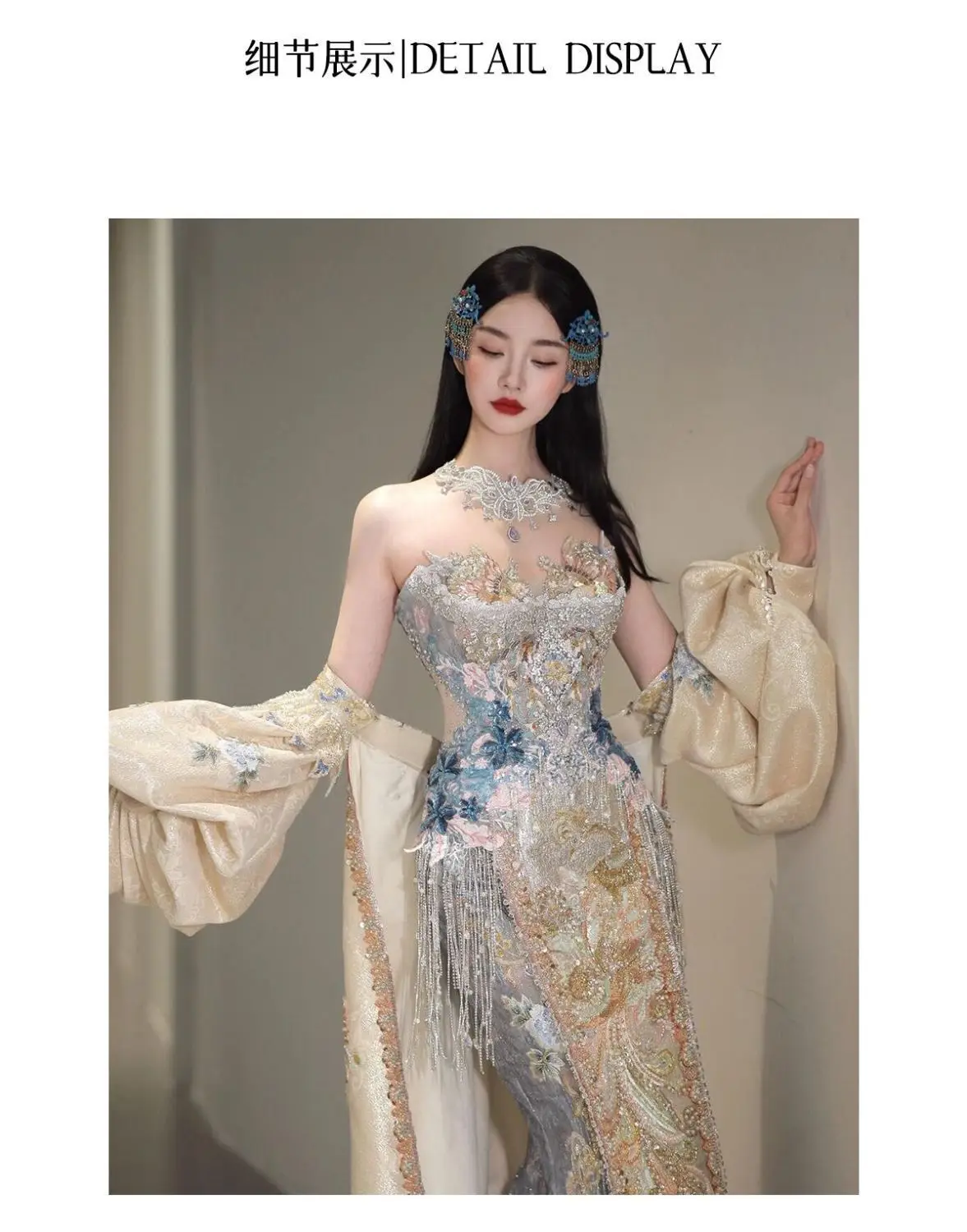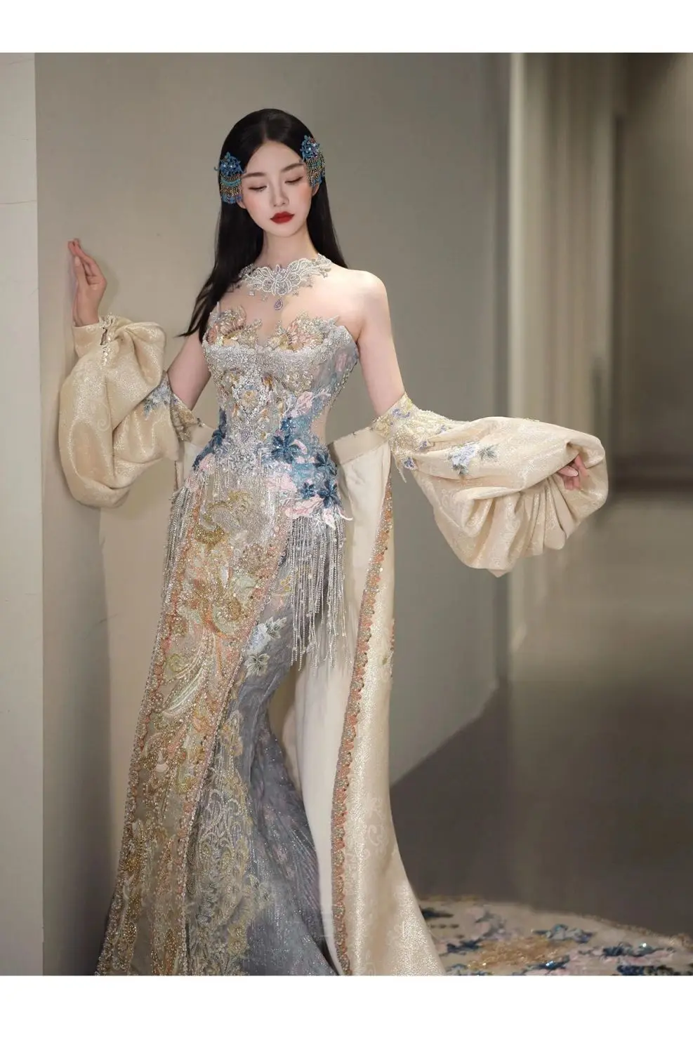 Robe de bal | Collection printemps-été 2026 | Robe de soirée longue en mousseline brodée, style princesse asiatique, avec peignoir amovible