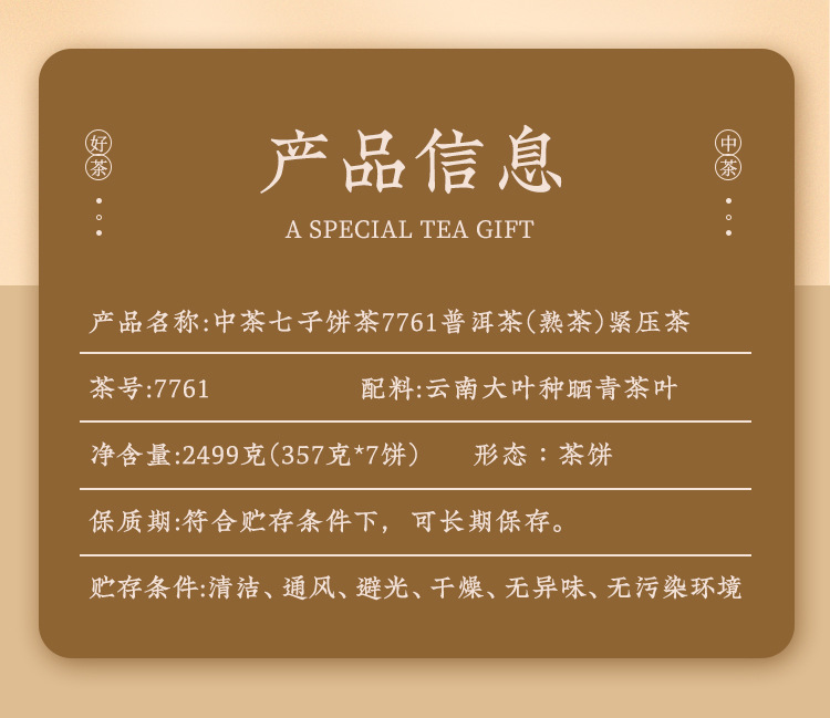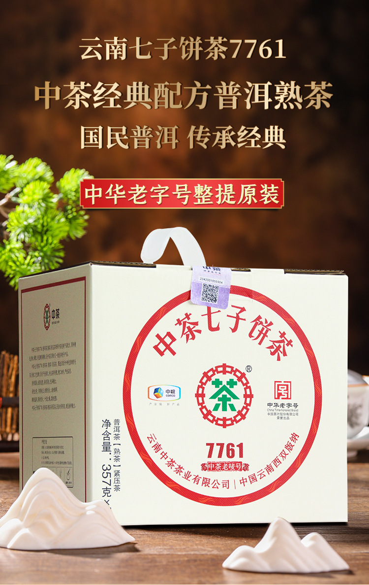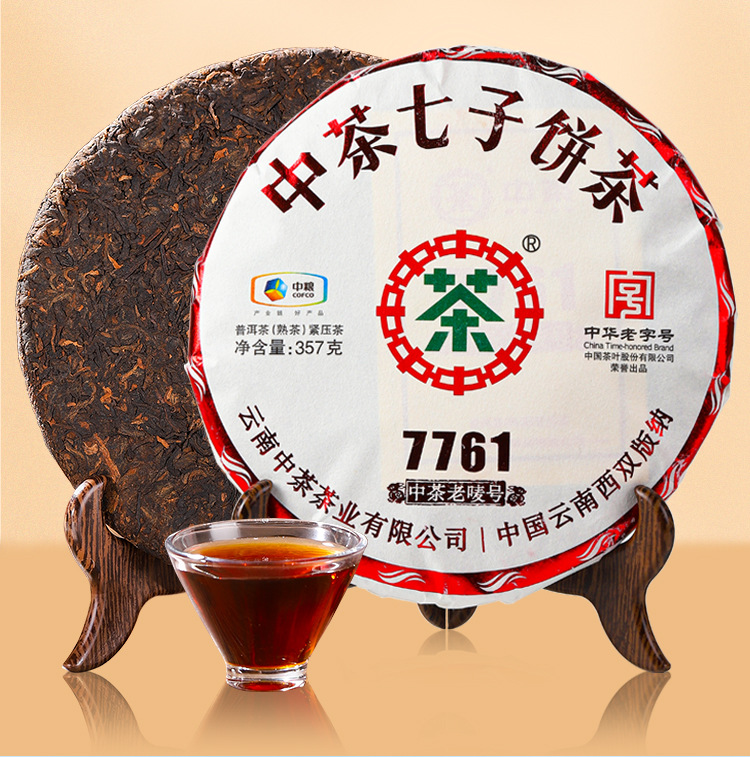 7761 Gâteau au thé chinois cuit Qizi classique du Yunnan 中茶七子(熟普)餅茶 357 g x 7 par caisse ; Marque chinoise séculaire pour les célébrations