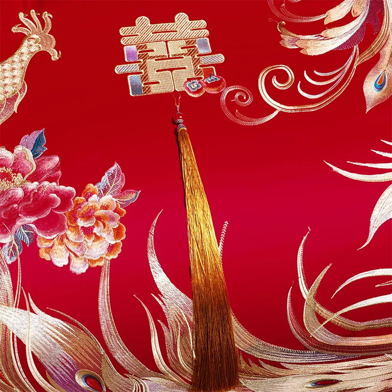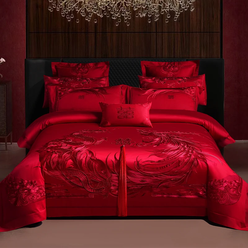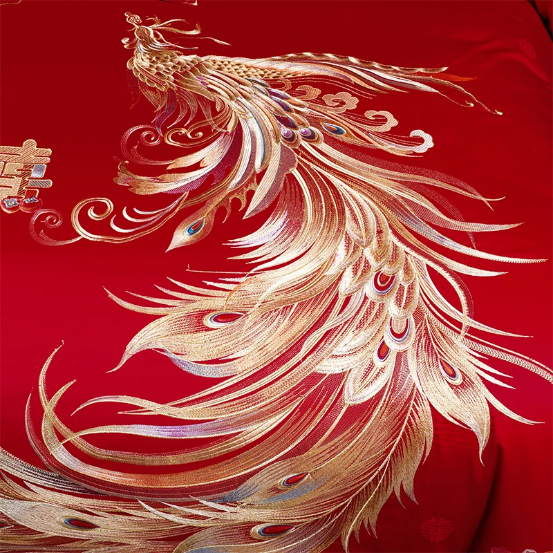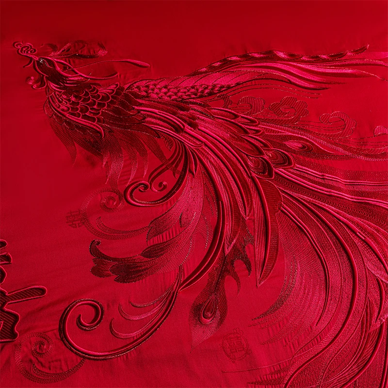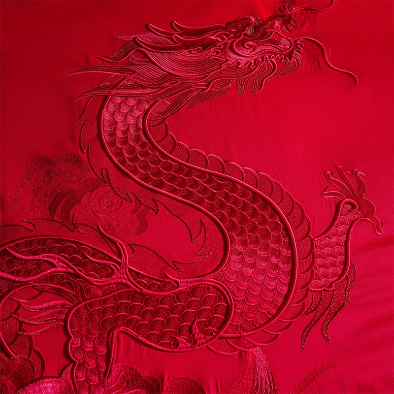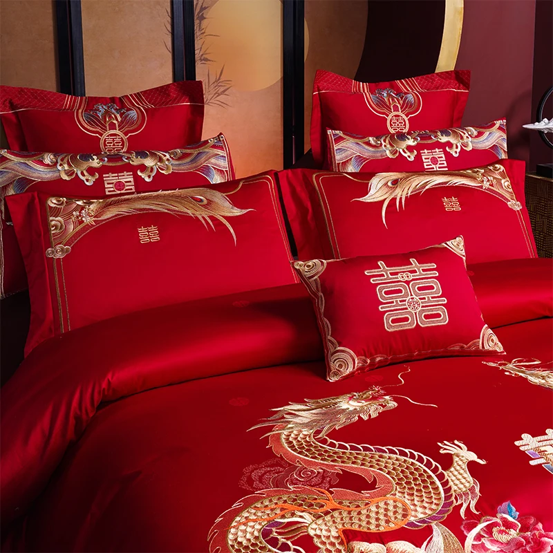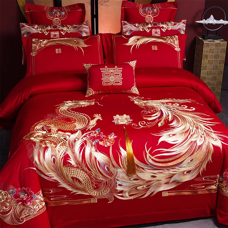 4/6/9Pcs Luxury Chinese Golden Dragon Phoenix 3D Embroidery Wedding Bedding Set; 100% Cotton Duvet Cover Bed Sheet Pillowcases in King and Queen Size