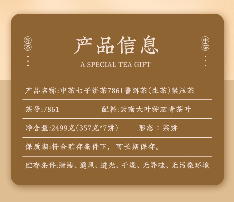 7861 Classic Yunnan Seven Buddha RAW Chinese Tea Cake 中茶七子(生)普洱茶餅 357g x 7 per Case; China Time-Honored Brand for Celebrations