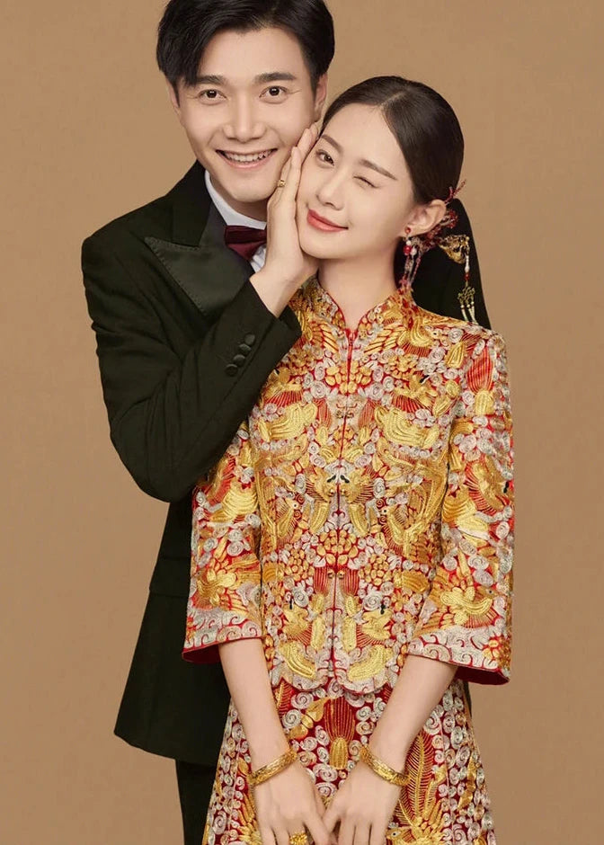 BRIDAL DRESS | 2026AW Traditional Embroidered Rhinestones Golden Dragon And Phoenix on Satin Bridal Cheongsam
