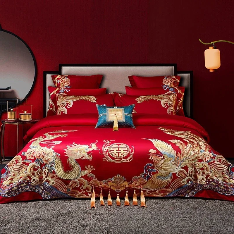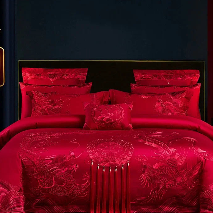 Pure Cotton Chinese Wedding Bedding Set in Red; 8/9/10 Piece Dragon Phoenix Floral Embroidery Tassels Duvet Cover Bed Sheet Pillowcases