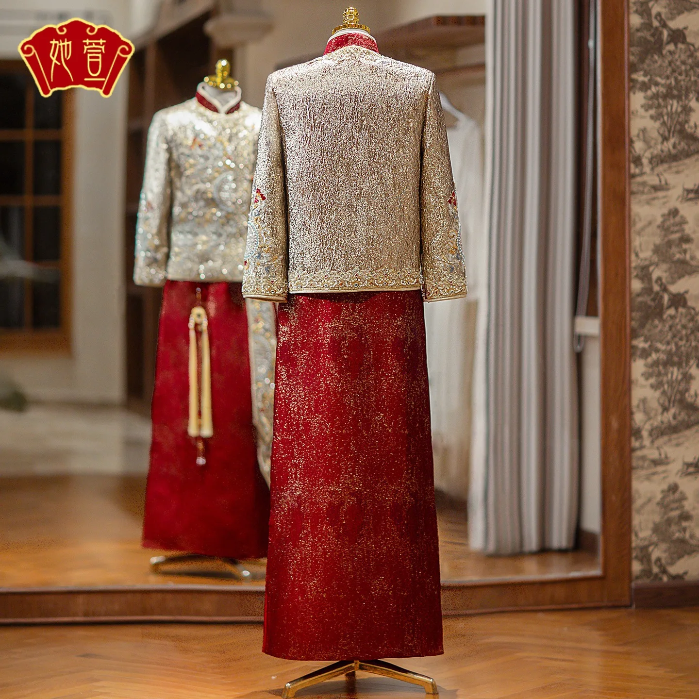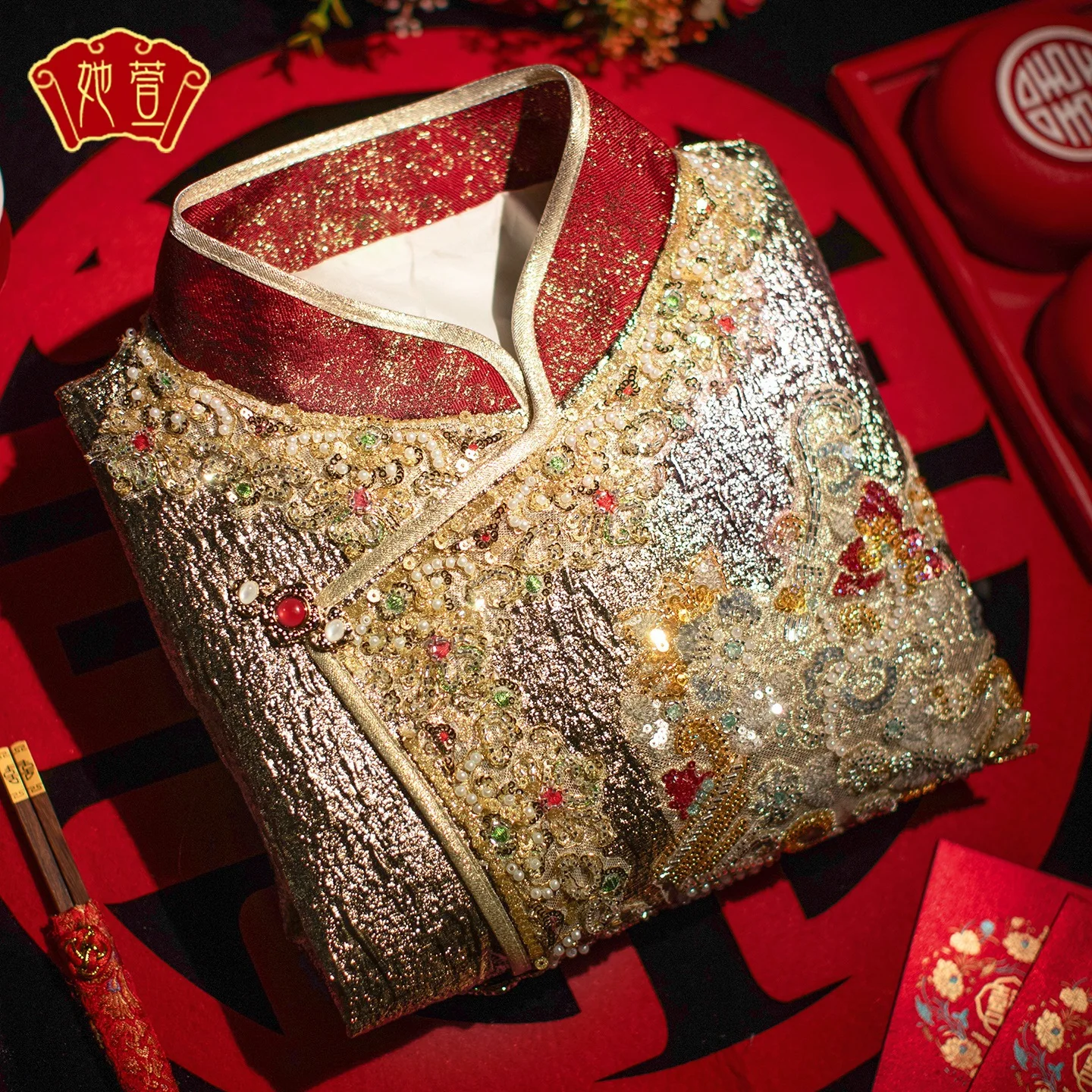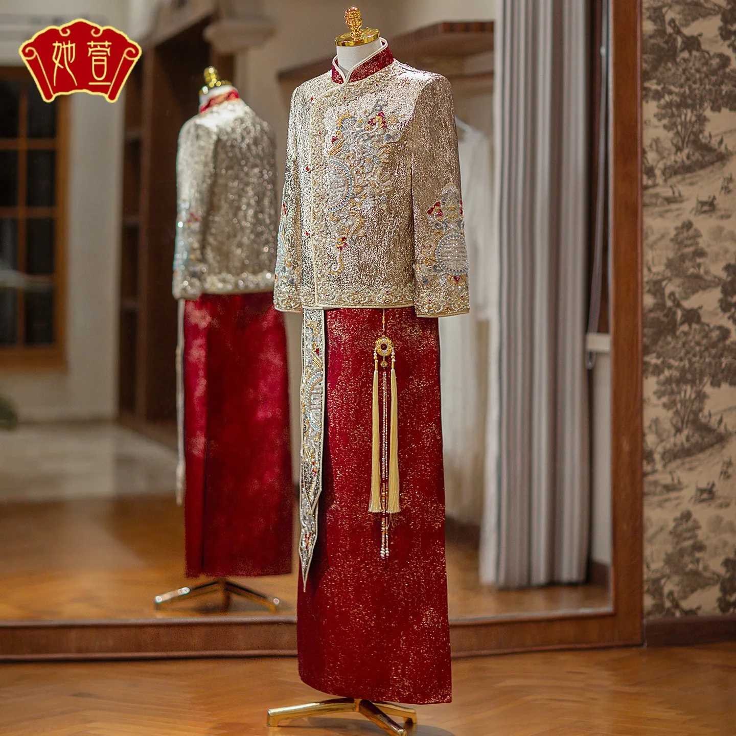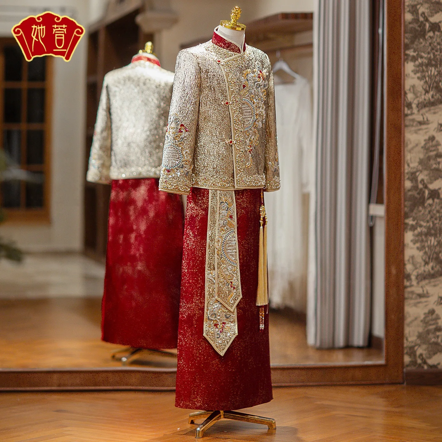 Luxury Textured Satin DOUBLE HAPPINESS Appliqué Cheongsam Sets for the Groom in Gold Colour; 2XL Plus Size