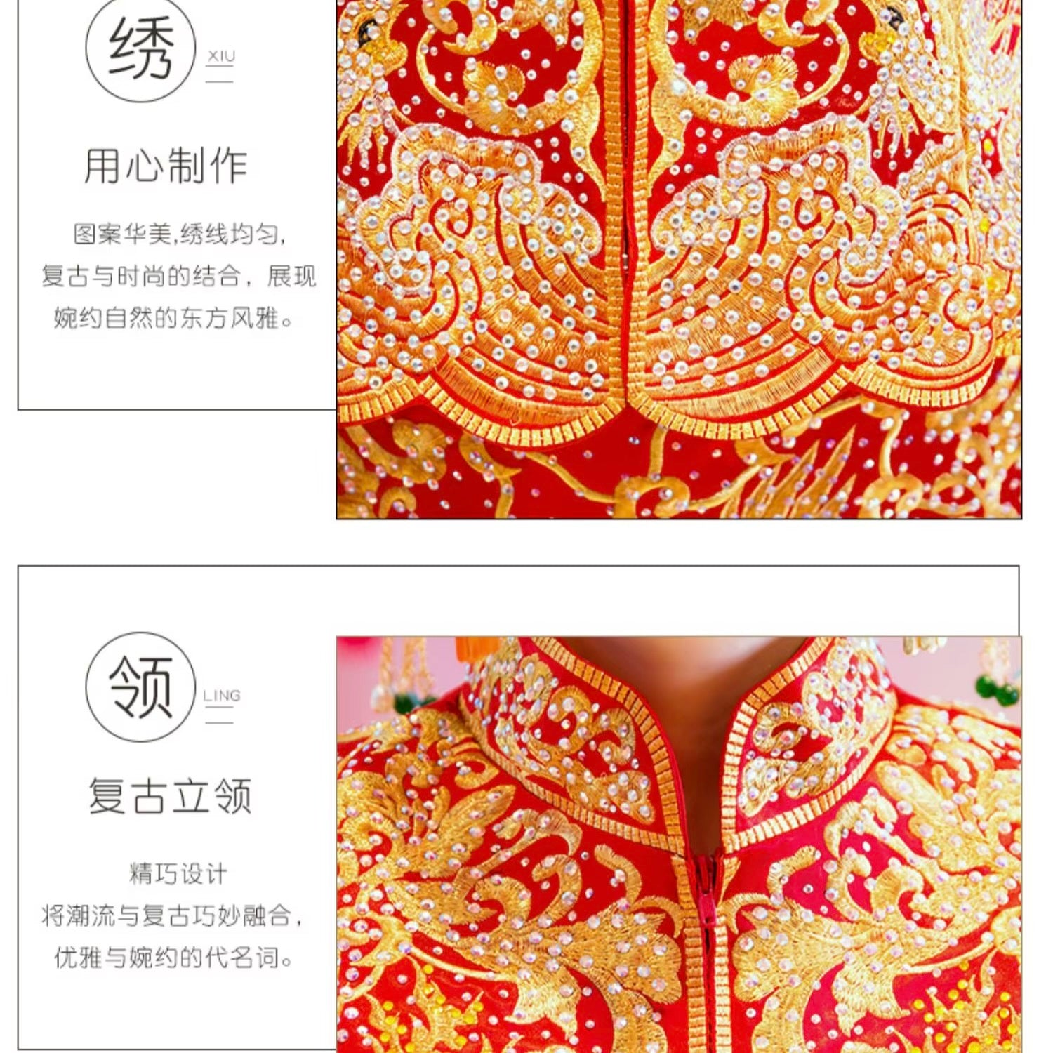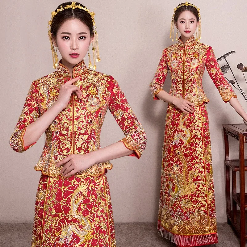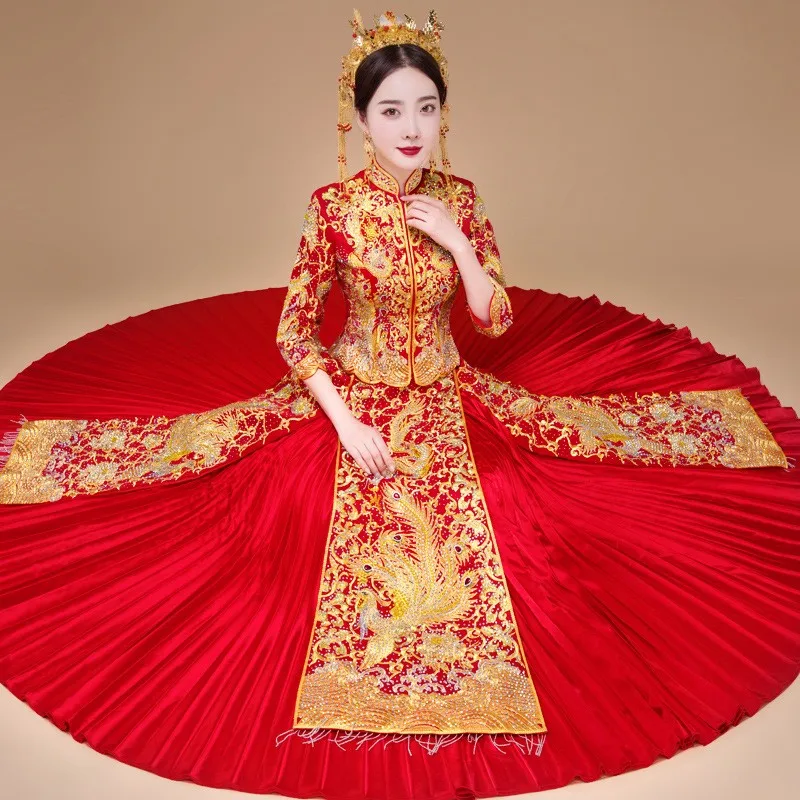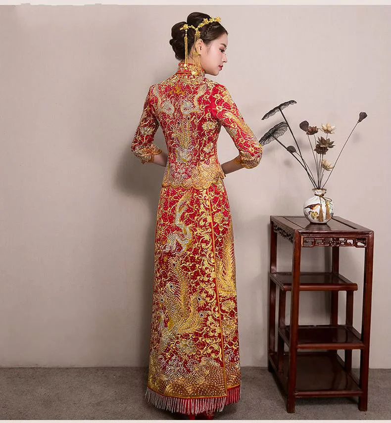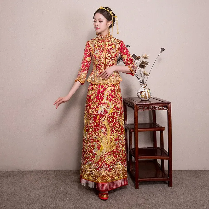Embroidered Golden Phoenix Slim Fit Chinese Wedding Cheongsam Traditional Bridal Dress in Peplum and A-Line Skirts with/out Rhinestones